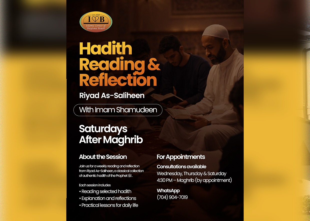 Join a weekly session exploring the timeless wisdom of Riyad As-Saliheen, a classical collection of authentic hadith of the Prophet ﷺ. Imam Shamudeen will guide the reading, share explanations, and highlight practical lessons we can apply in our daily lives. 🗓 Saturdays — After Maghrib